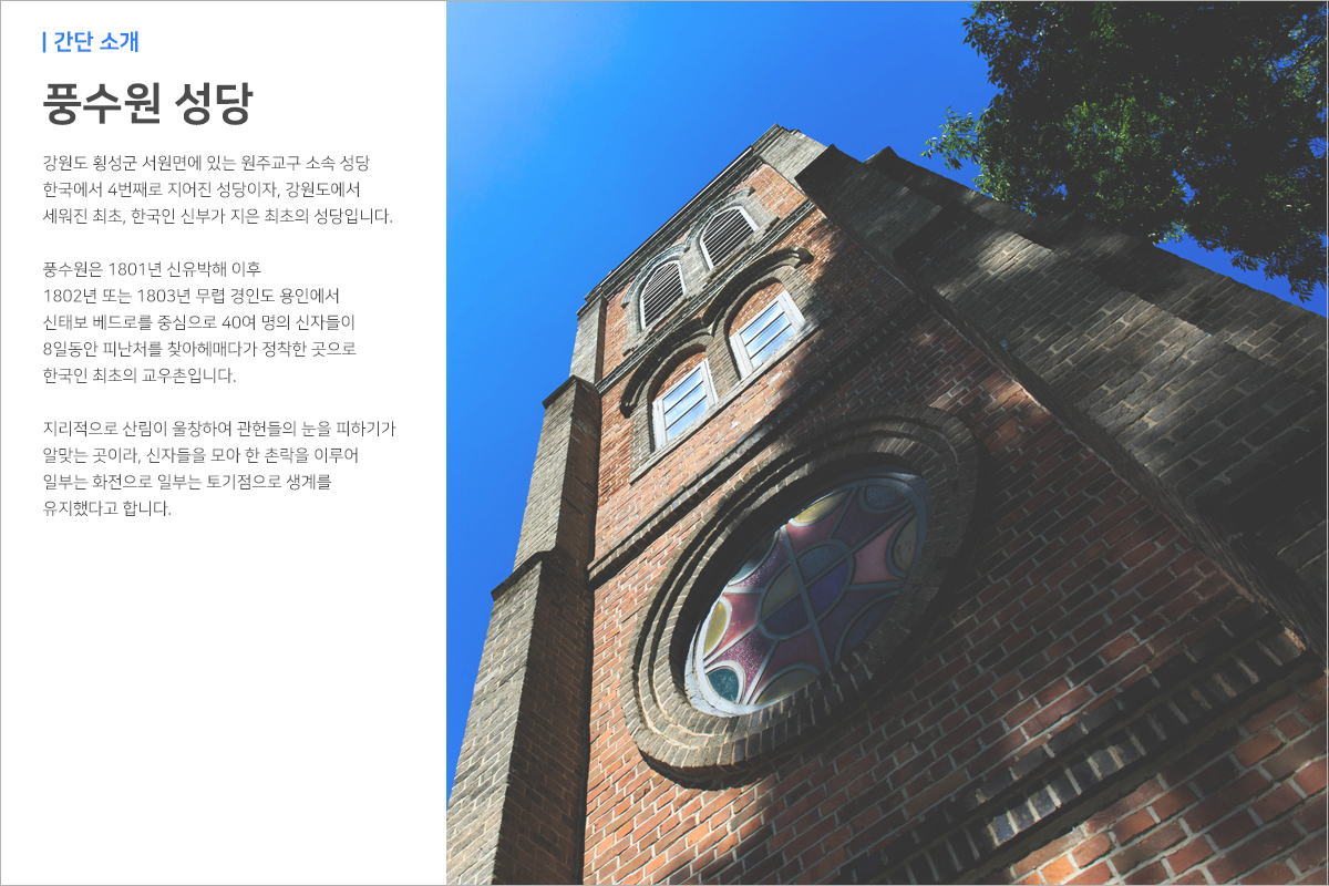 강원도 횡성군 서원면 유현리에 위치한 풍수원 성당은 1802년~03년경 1801년에 발생한 신유박해 이후에 경기도 용인에서 신태보 베드로를 중심으로 하여 40여명의
