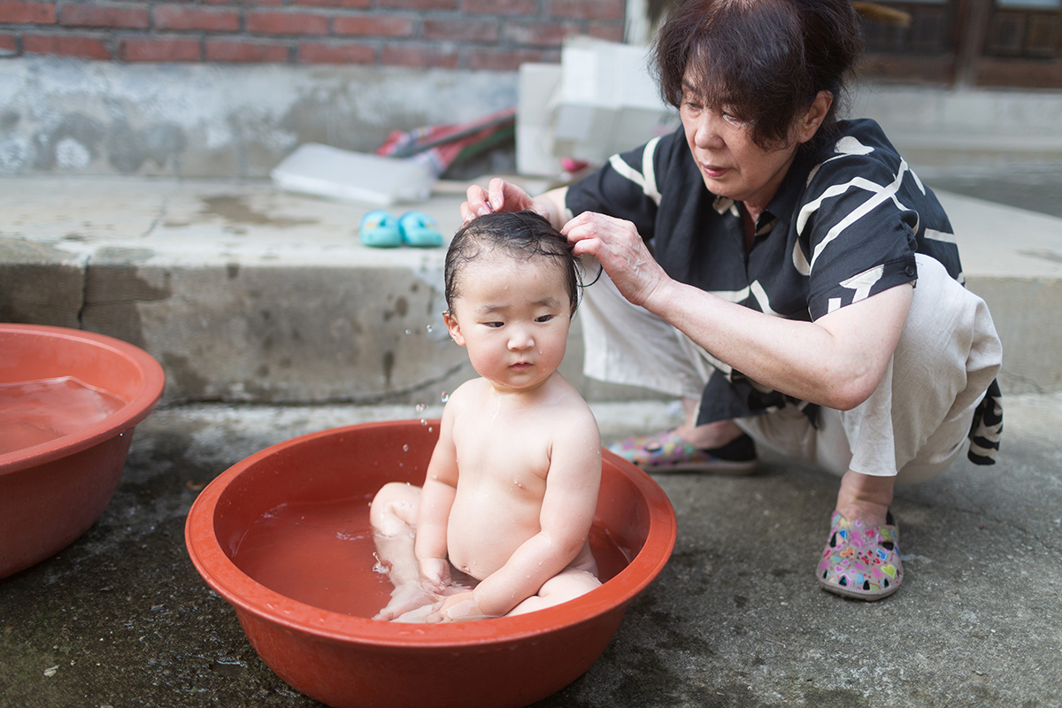 남한산성에서 내려오는 물은 한여름에 어른들에게도 차가워서 따뜻한 물을 담은 다라에서 아이들을 씻겨봅니다