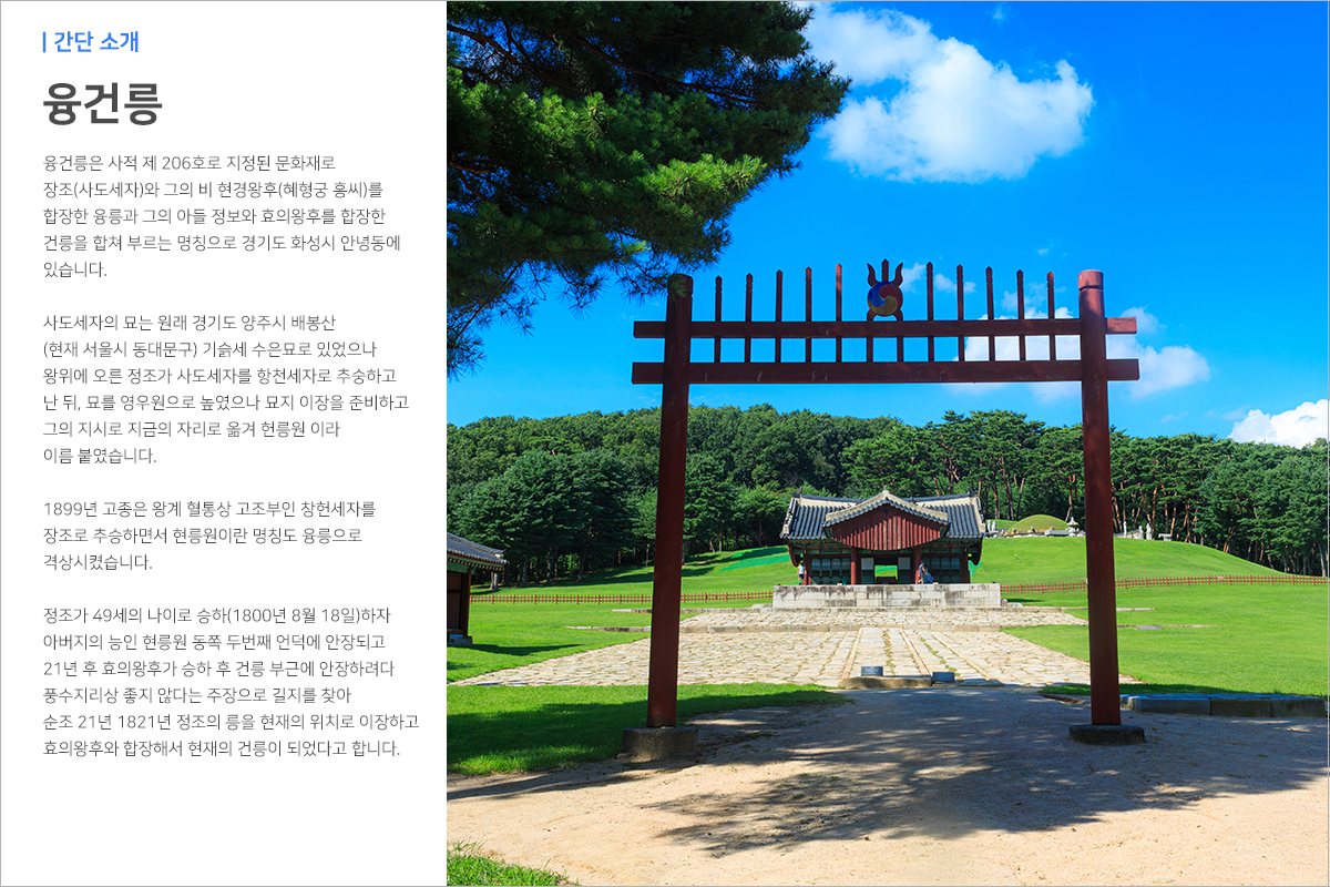 융건릉은 정조의 아버지이자 영조의 아들인 사도세자의 묘(융릉)와 그의 아들 정조의 묘(건릉)이 있는 곳으로