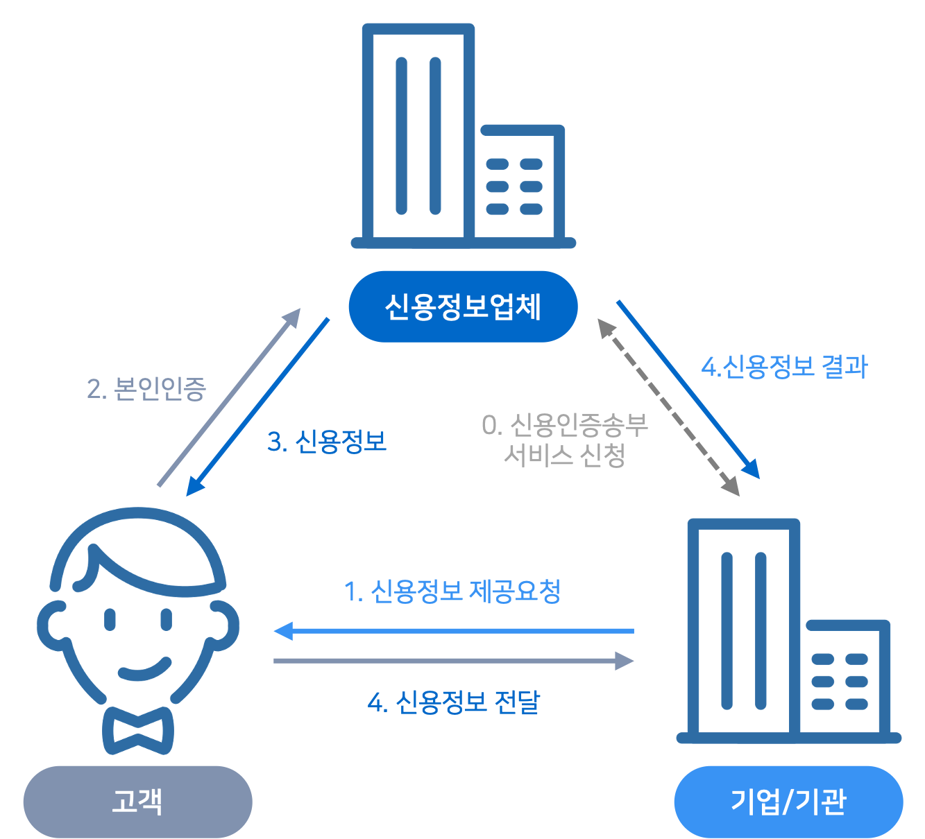 신용정보가 필요한 기업/기관에서 고객에게 요청을 하게 되면 고객은 신용정보업체에서 본인확인(휴대폰,신용카드,공동인증서 등) 후