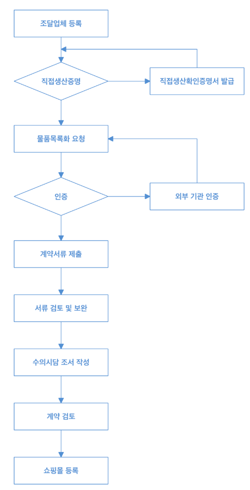 나라장터 쇼핑몰에 상품을 등록하기 위해서는 미리 외부 인증을 진행해두는 것이 바람직합니다. - 서류들이 모두 준비되면 준비된 서류를 우편으로 조달청 담당부서로 제출하고 상품 등록을 위한 협상 절차가 진행됩니다.